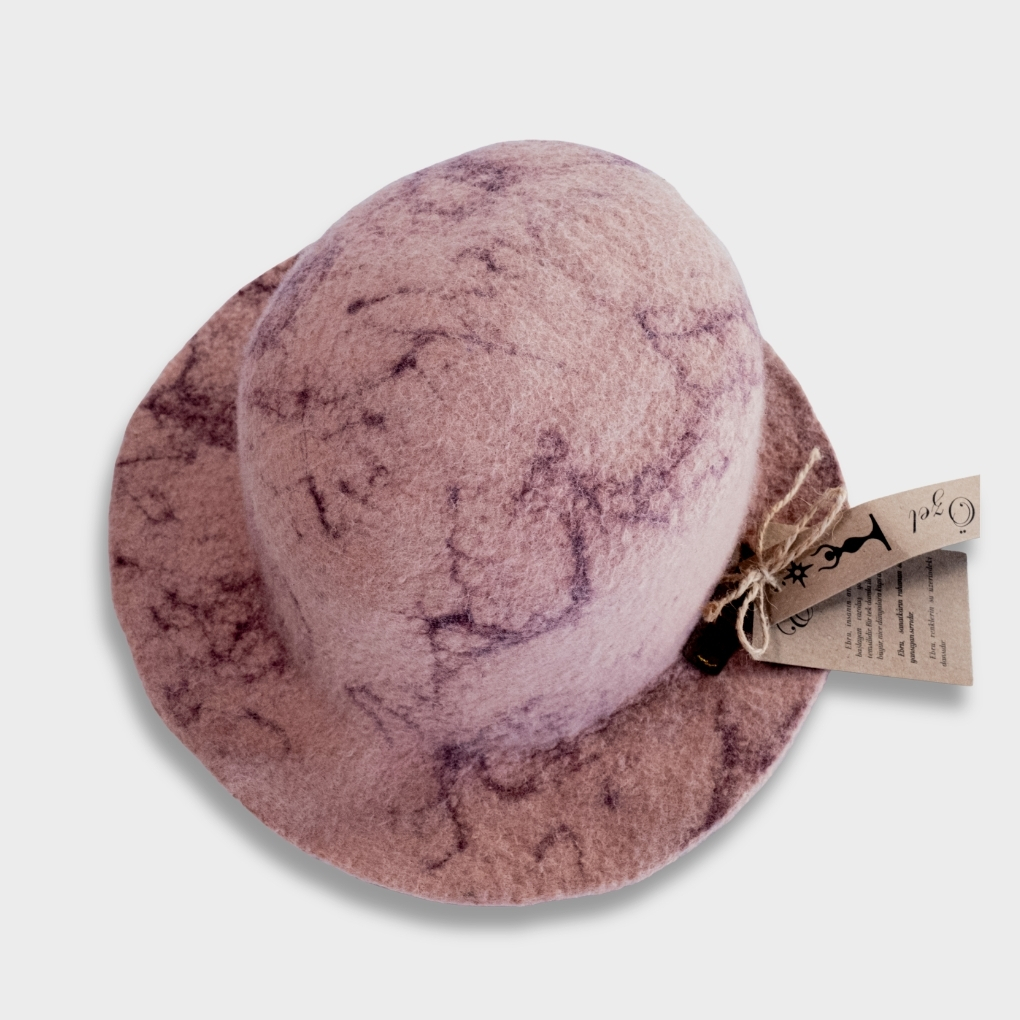 Doğal yünün nefes alan yapısı sayesinde şapka hafif, sıcak ve formunu koruyan bir kullanım sunar. Lilanın yumuşak tonu üzerindeki dumanlı mermerimsi izler, stilinize sakin bir zarafet ve sofistike bir karakter kazandırır. Esnek keçe yapısı başa nazikçe oturur; günlük kullanımda konforlu ve şık bir tamamlayıcıdır.