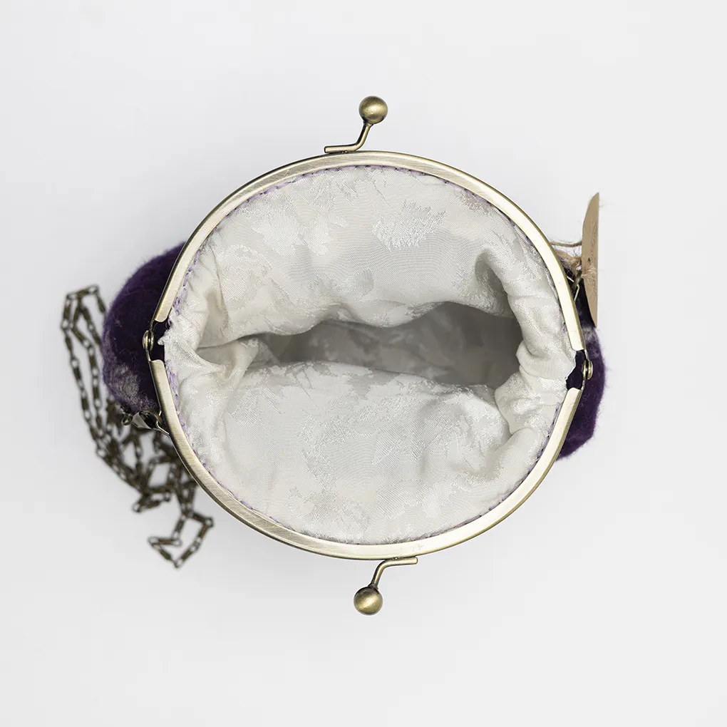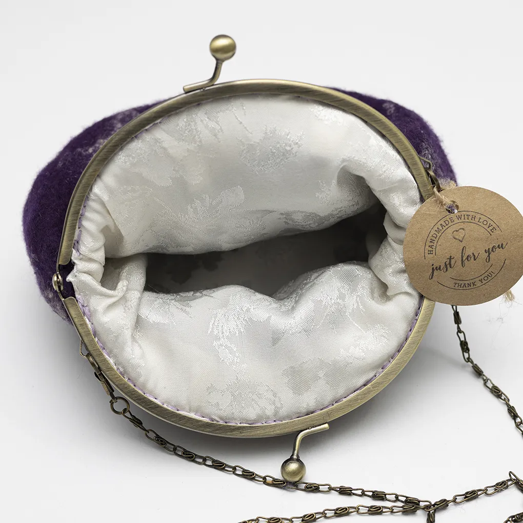 Derin mor tonların dumanlı gri geçişlerle buluştuğu bu desen, stilinize sofistike bir karakter ve zamansız bir zarafet kazandırır. El dikimi keçe dokusu hafif, yumuşak ve formunu koruyan bir kullanım sunar; günlük kullanım için uygundur.