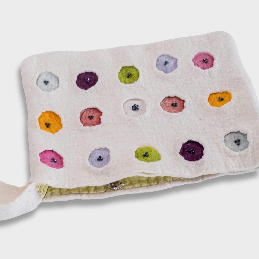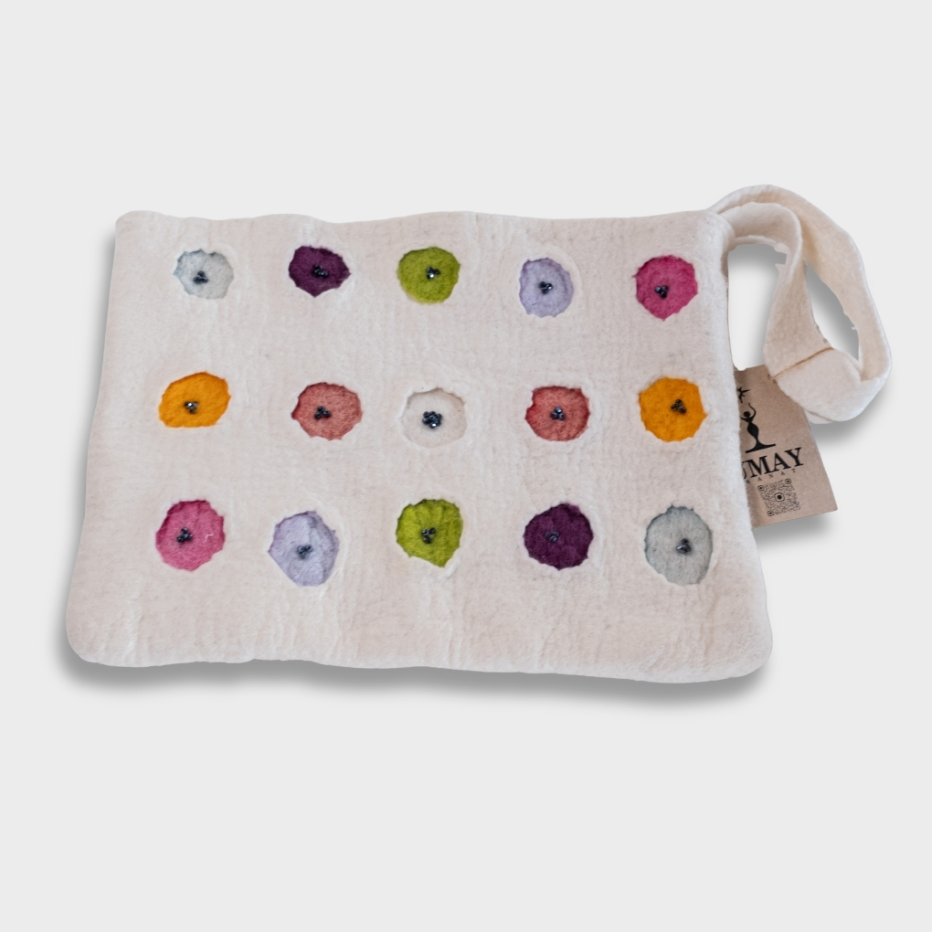 Krem beyaz zeminde sıralanan renkli çiçek detayları, stilinize neşeli bir enerji ve zamansız bir zarafet kazandırır. El dikimi keçe dokusu hafif, yumuşak ve formunu koruyan bir kullanım sunar; günlük kullanım için uygundur.