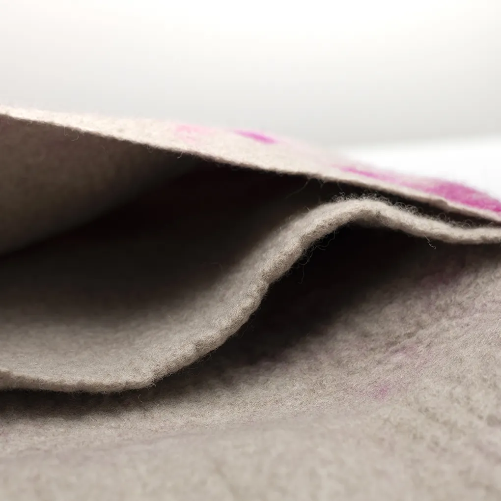 Pudra pembesinin yumuşak tonu üzerine serpiştirilen fuşya benekler, stilinize canlı ama zarif bir enerji ve zamansız bir şıklık kazandırır. El dikimi keçe dokusu hafif, yumuşak ve formunu koruyan bir kullanım sunar; günlük kullanım için uygundur.